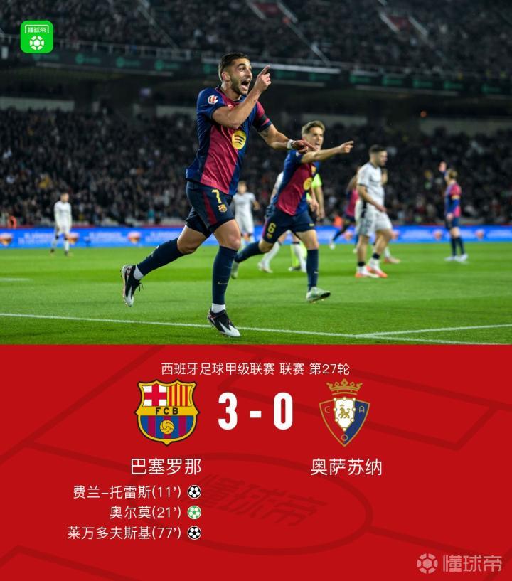 北京时间3月28日,西班牙足球甲级联赛第27轮,巴塞罗那主场迎战奥萨苏纳。上半场,比赛进行到第11分钟,巴尔德横扫门前,费兰包抄破门,为巴萨打开了比分。随后在第21分钟,埃雷拉获得了一次黄点套餐,奥尔莫重新罚点,成功命中,将比分扩大至2-0。接着奥尔莫受伤被换下场,费尔明替补登场,并在下半场的第77分钟精准传中,助攻莱万鱼跃头球入网,最终巴塞罗那3-0击败对手。