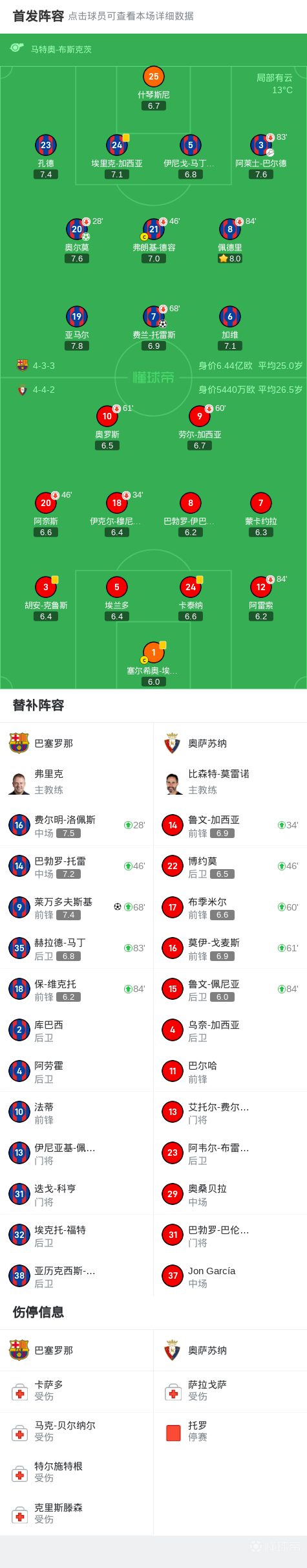 下半场比赛继续进行,巴塞罗那依旧占据主动。第56分钟,亚马尔下底送到门前,费兰想要包抄可惜被对方抢先解围,错失良机。但在第77分钟,费尔明展现出色的反击能力,精准传中到禁区,莱万凭借出色的头球攻门,将比分扩大至3-0。此后的比赛中,双方都有不少机会,但都未能破门。最终比赛结束,巴塞罗那3-0完胜奥萨苏纳,全取三分。